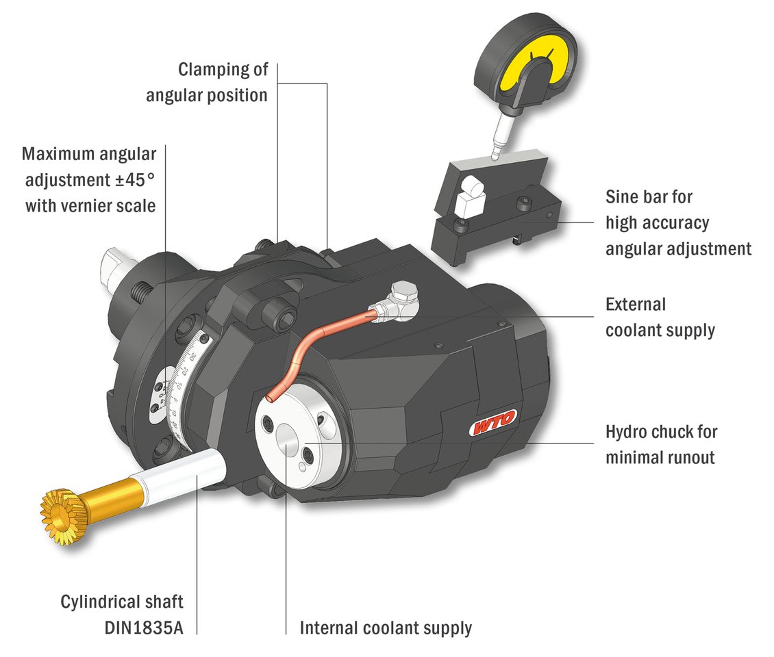WTO 刮齿刀座提供了高刚性及高跳动精度. 主轴上的液压夹头提高了刀具更换的精度及快速.
