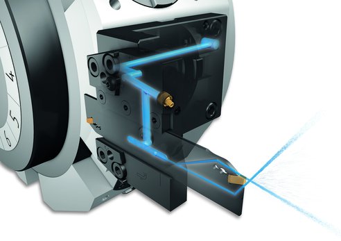 带最高冷却润滑液压力1160 PSI (80 bar) 的切断刀座大大地提高刀具的使用寿命及切削性能.