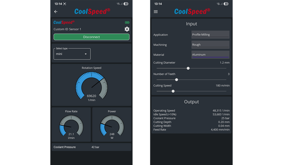 The App „CoolSpeed®“ connects to the Bluetooth Pressure Gauge and displays the rotation speed, coolant pressure, flow rate and power of the high-speed spindle in real time.